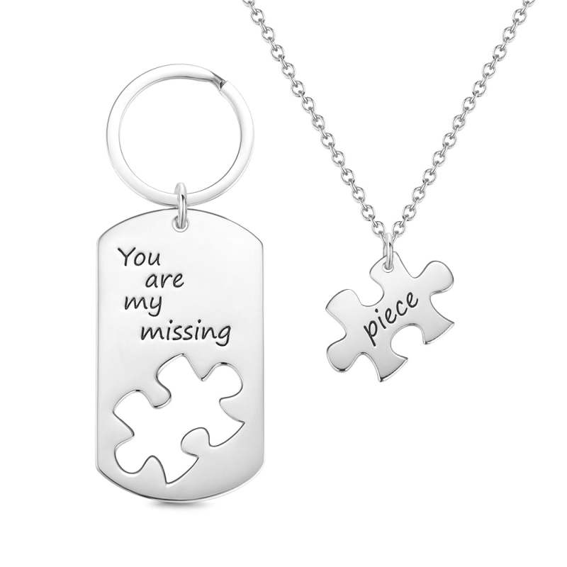 Custom Engraved Couple Keychain and Necklace Set - Puzzle Dog TagValentine's Day