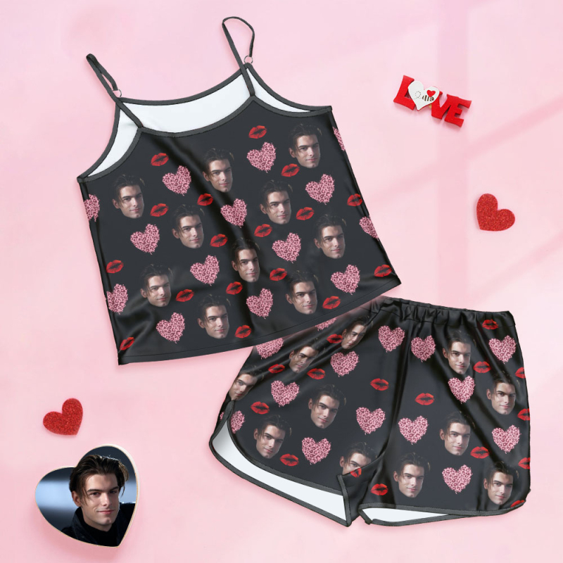 Custom Face Camisole Sleepwear Personalized Lingerie Set Kiss And Pink Heart Gift For Her