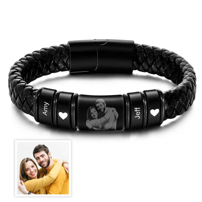 Custom Photo Engraved Bracelet Personalized Leather Men's Bracelet Anniversary Gift