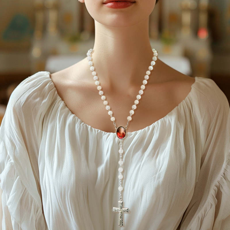 Custom Rosary Beads Cross Necklace Personalized Baptism Gift, First Communion Gift, Confirmation, Baby or Little Girl Keepsake Sentimental Memorial Gift Prayer Aquamarine Chalcedony Beads Necklace with Photo