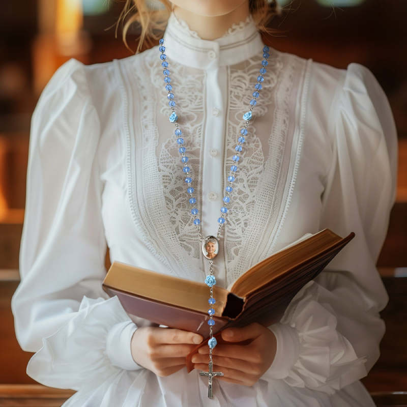 Custom Rosary Beads Cross Necklace Memorial Gifts for Catholics Personalized Hip-Hop Style Baptism Gift, First Communion Gift, Confirmation, Baby or Little Girl Keepsake Multi-Color Crystal Necklace with Photo