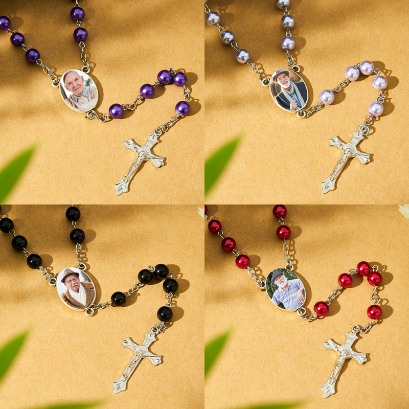 Custom Rosary Beads Cross Necklace Sentimental Memorial Gifts for Catholics Personalized Glass Imitation Pearls Necklace with Photo