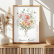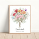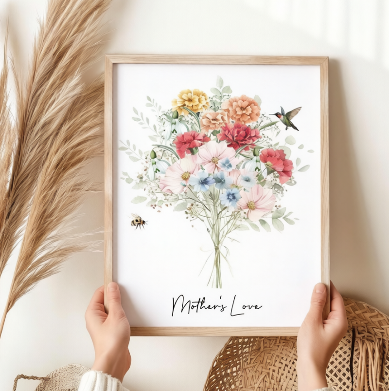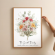 Family Birth Flower Bouquet Gift for Mom Personalized Watercolor Birth Month Flower Print Beech Wood Names Frame Mother's Day Gift
