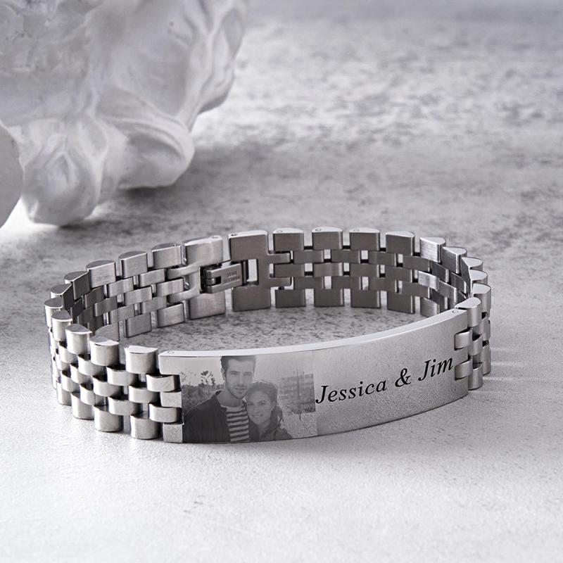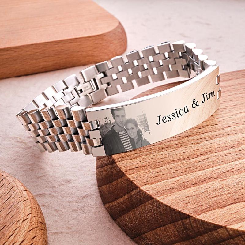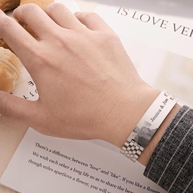 Personalized Photo Wide Bracelet With Text Engraved Vintage Bracelet Gifts For Him