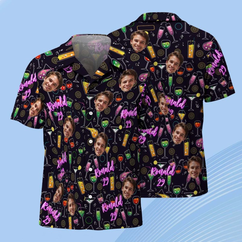 Custom Face Hawaiian Shirt with Name & Age Funny Cocktail Birthday Shirt for Men, Party Outfit, Beach Vacation, Bar Night Gift Idea